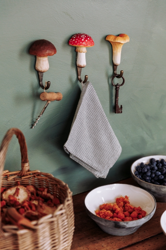 Designed in Sweden by Wildlife Garden. Hand carved from wood and hand painted. Each hook is unique. Three varieties of mushroom to choose from. Bronze coloured metal hook, maximum load weight 10kg